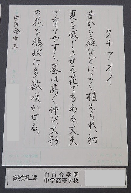 全日本書芸文化院主催 第72回全国書道コンクールにおいて、白百合学園中学高等学校が団体優秀賞を受賞しました。個人でも、優秀賞など多数受賞しました。以下の写真は会場に展示された作品と授賞式のものです。