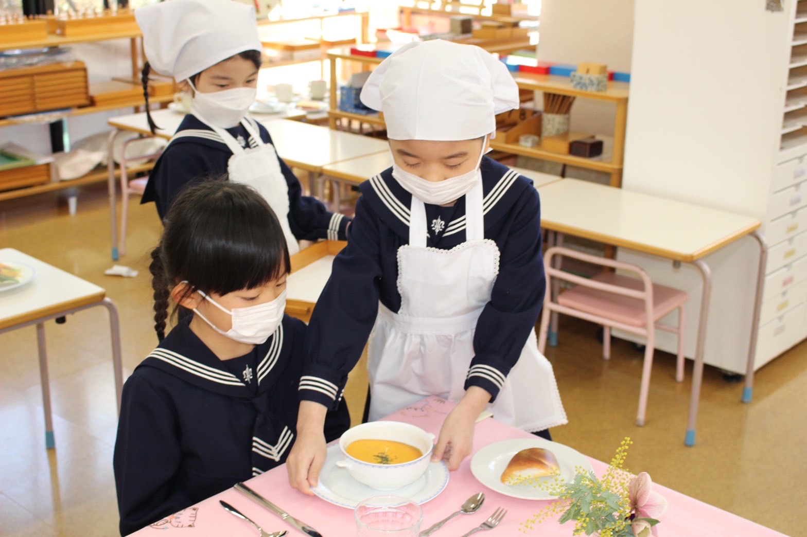 2022年2月25日(金)幼稚園にて年長児はテーブルマナーを行いました。卒園前の締めくくりの行事として、今までモンテッソーリ教育の中で学んだことが生かされるよう、食事のマナーだけでなく、食卓の準備やサービスの仕方を学びました。友達と力を合わせ、お盆で食器を運び、セッティングをし、お客様のおもてなしをしました。今年はみんなで食事を頂くことはできませんでしたが、本物のレストランのような雰囲気の中、思い出に残る楽しい一日を経験しました。